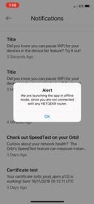 An alert notification displays in the Nighthawk app if the app can't detect a router.